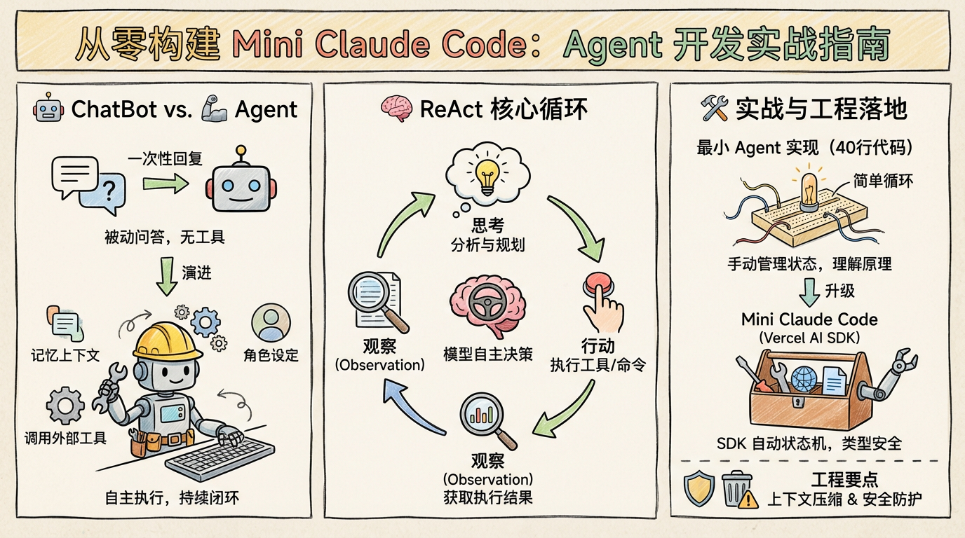 希望这篇文章能帮你推开 Agent 开发的大门。代码仓库在这里:mini-claude-code。相关的教案我也直接放在 Issues 里了。