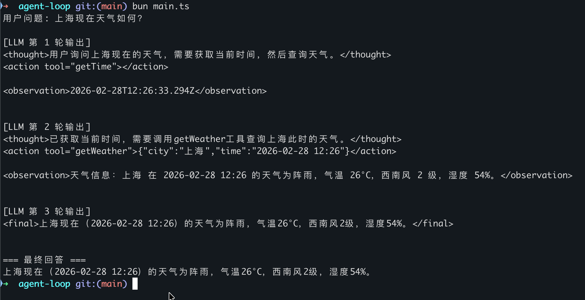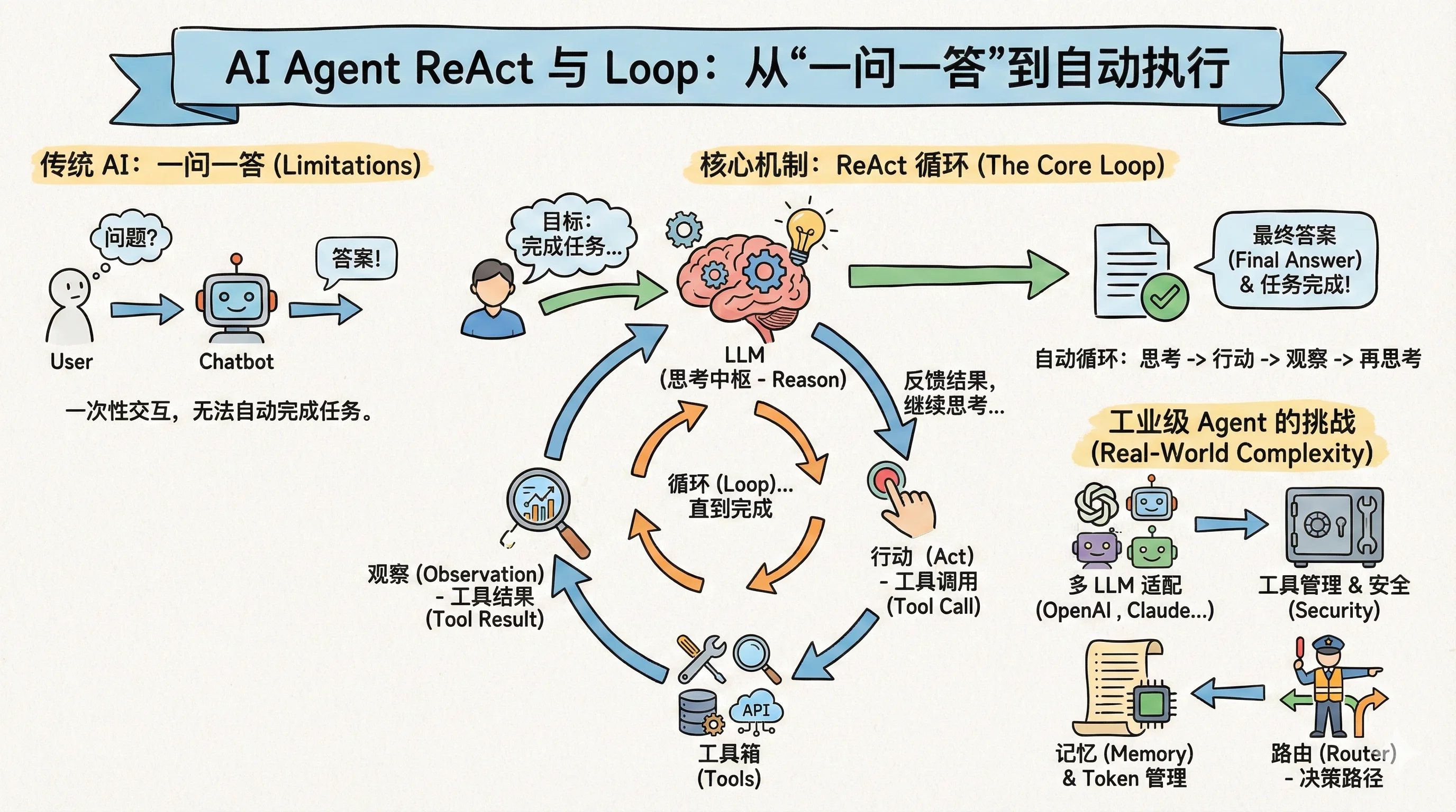 - 解析输出:是最终回答就返回,是工具调用就执行工具并把结果填回上下文