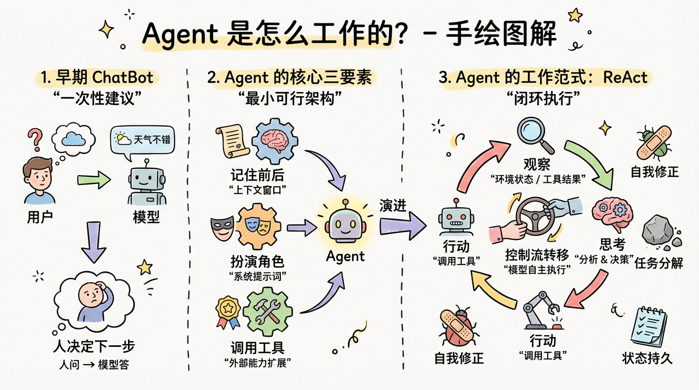 这正是早期 ChatBot 与现在 Agent 的本质区别:前者是"一次性建议",后者是"闭环执行"。