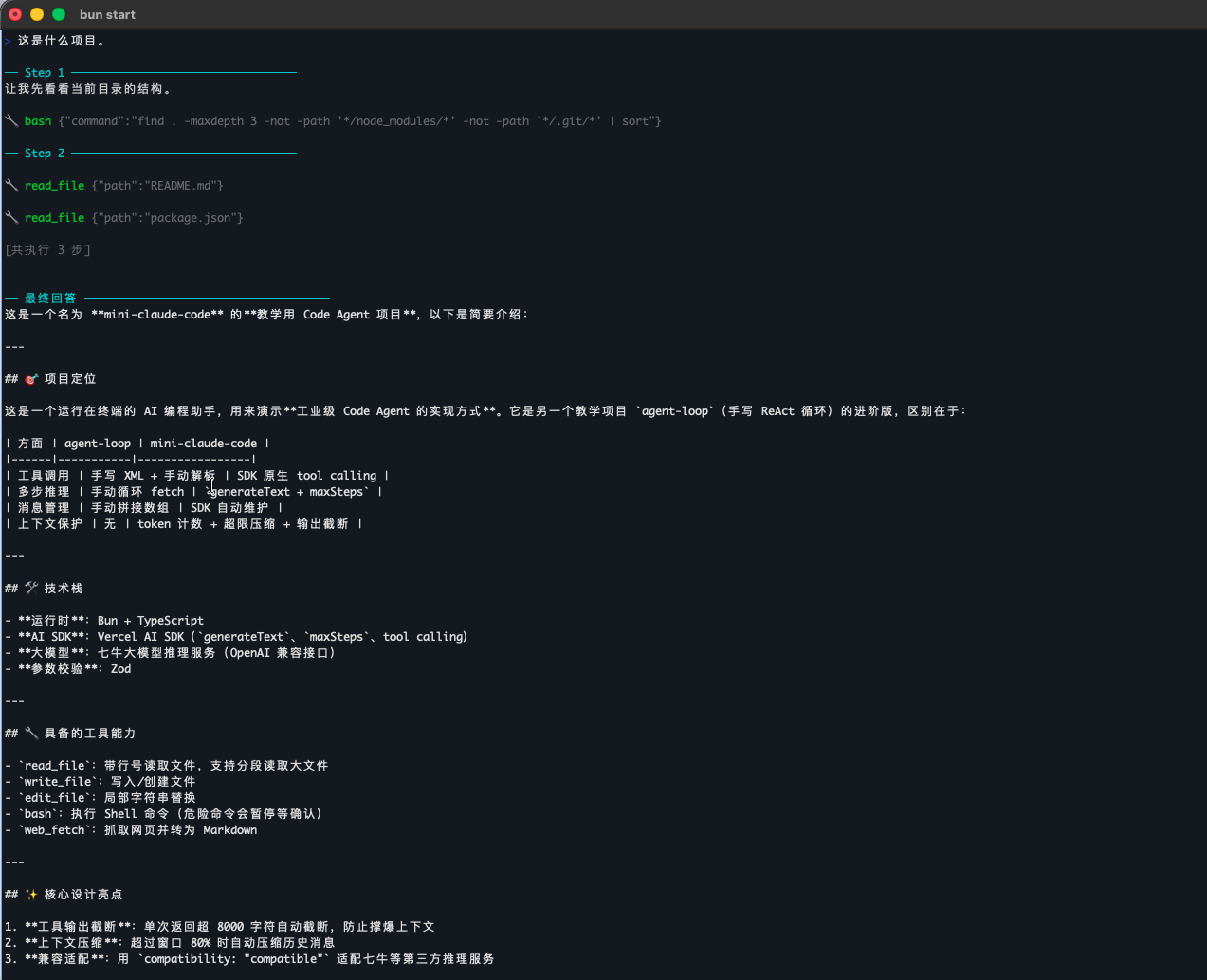这里我们问 Mini Claude Code 这是什么项目,效果如下: