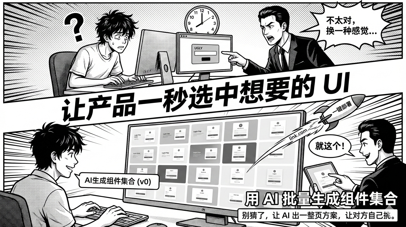 | 沟通方式 | 文字描述 → 开发猜 → 做一版 → 不满意 → 再改 | 批量生成 → 产品自己挑 → 一次到位 |