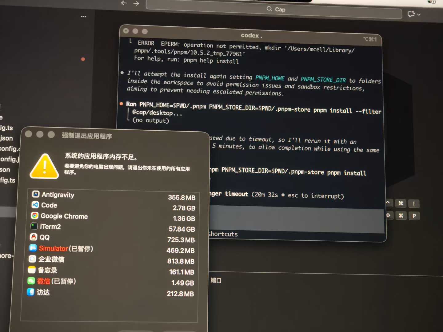 发生在 codex CLI。那次我让 codex 帮我改一个开源项目(Cap,我想去掉其中收费模块),然后——内存泄露了。