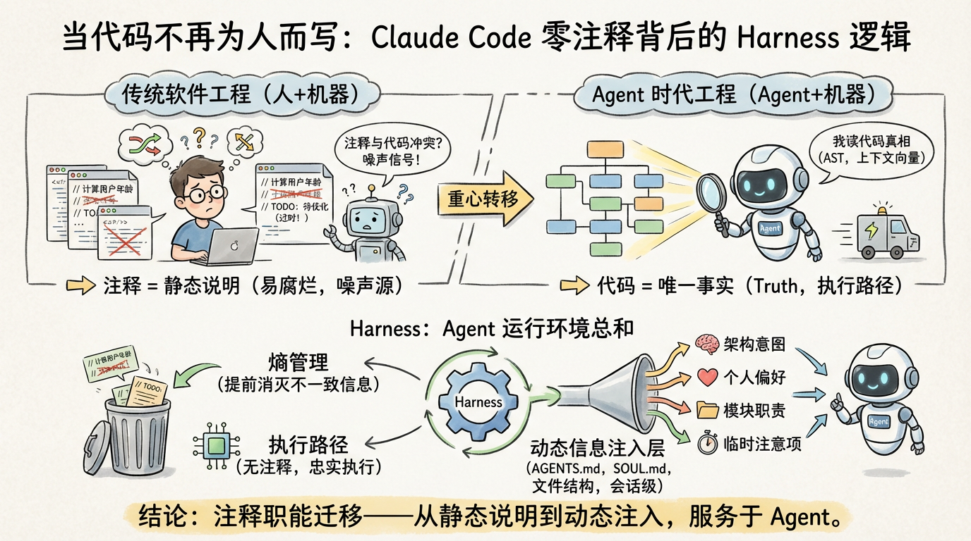 当协作对象从「人 + 机器」变成「Agent + 机器」,代码注释的定位必须重新评估,它的职能应该从「代码内的静态说明」,转移到 Harness 的动态信息注入层里去。